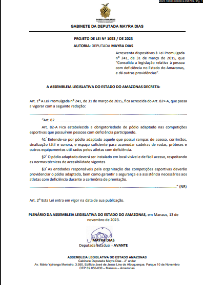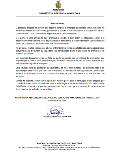 Na área da inclusão, Mayra Dias também é autora do PL nº 1053/2023, que reforça os direitos da pessoa com deficiência e obriga o poder público a garantir acessibilidade e comunicação inclusiva em campanhas institucionais. A deputada defende que o Amazonas precisa “avançar na efetividade das políticas públicas e não apenas na legislação simbólica”.
