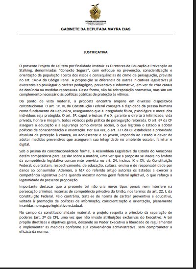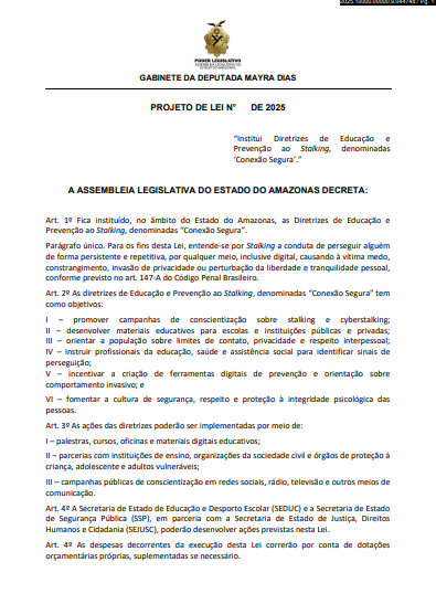 Entre os projetos mais recentes está o “Conexão Segura” (PL nº 899/2025), que cria um programa estadual de educação digital e combate ao stalking e ao assédio virtual. A proposta prevê parcerias com escolas, universidades e plataformas digitais para promover ações de prevenção e orientar vítimas sobre como denunciar casos de perseguição.