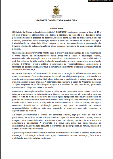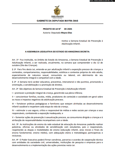 Também tramita na Casa o Protocolo Estadual de Enfrentamento à Sexualização e Adultização de Crianças (PL nº 721/2025), que institui ações intersetoriais entre as secretarias de Educação, Segurança Pública e Assistência Social para identificar e prevenir conteúdos e práticas que incentivem a erotização precoce de menores.