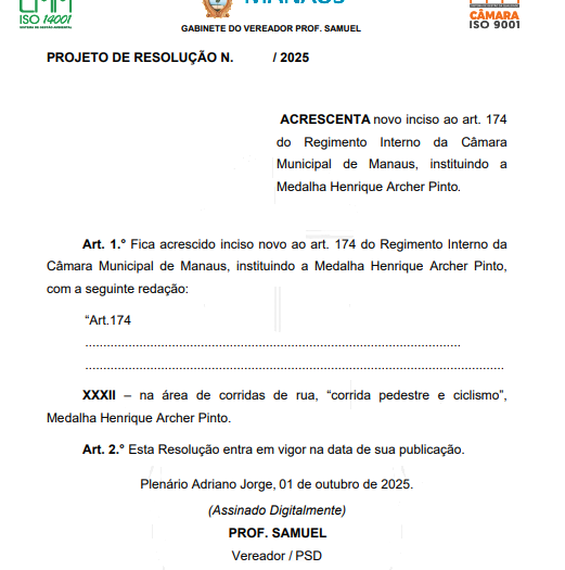 O vereador Professor Samuel (PSD) propôs a criação da “Medalha Henrique Archer Pinto”, a ser incorporada ao artigo 174 do Regimento Interno da Câmara Municipal de Manaus (CMM). A honraria será concedida a personalidades que se destacarem na área de corridas de rua, corrida pedestre e ciclismo.