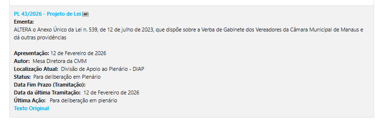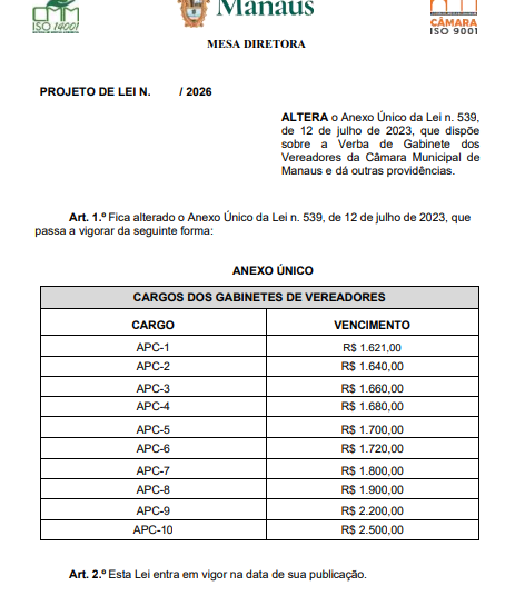 A Mesa Diretora da Câmara Municipal de Manaus (CMM) apresentou um Projeto de Lei (PL) que altera o Anexo Único da Lei nº 539, de 12 de julho de 2023, para atualizar os vencimentos dos Assistentes Parlamentares Comissionados, conhecidos como APCs, que atuam nos gabinetes dos vereadores.