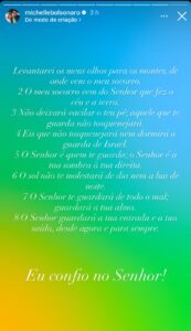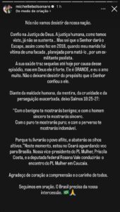 Michelle citou ainda trechos do Salmo 18 e afirmou que estava no Ceará, de onde seguiria para Brasília. Na mesma publicação, agradeceu o apoio de seguidores e disse que continua em oração.