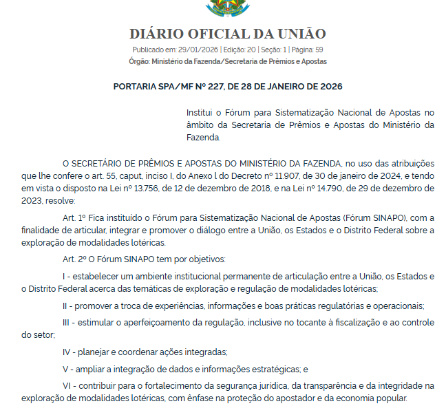 O Ministério da Fazenda instituiu o Fórum para Sistematização Nacional de Apostas, um espaço permanente de articulação entre a União, os estados e o Distrito Federal para tratar da exploração e da regulação das modalidades lotéricas no país. A medida foi oficializada por meio de portaria publicada no Diário Oficial da União (DOU) desta quinta-feira (29/1).