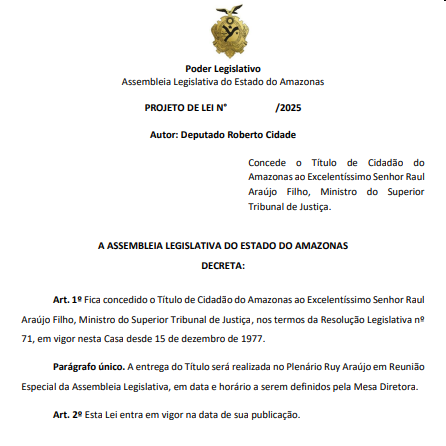 A Assembleia Legislativa do Amazonas (Aleam) poderá conceder o Título de Cidadão do Amazonas ao ministro do Superior Tribunal de Justiça (STJ), Raul Araújo Filho, conforme projeto de autoria do deputado estadual e presdiente da Casa Legislativa Roberto Cidade (União Brasil). A entrega da honraria será realizada em Reunião Especial no Plenário Ruy Araújo, em data e horário que ainda serão definidos pela Mesa Diretora da Casa.