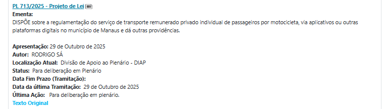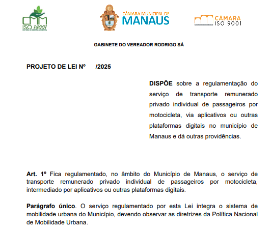 O vereador Rodrigo Sá (PP) protocolou nesta quarta-feira (29/10), na Câmara Municipal de Manaus (CMM) o Projeto de Lei n.º 713/2025, que regulamenta o serviço de transporte remunerado privado individual de passageiros por motocicleta, realizado por meio de aplicativos e outras plataformas digitais na capital amazonense.