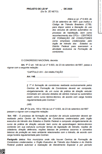 Além das mudanças na habilitação, o projeto também reorganiza as regras sobre a formação de condutores no país. A proposta define que poderão atuar nesse processo as autoescolas ou Centros de Formação de Condutores, responsáveis pela habilitação, especialização e reciclagem de motoristas em todas as categorias, além da capacitação de instrutores e examinadores de trânsito.