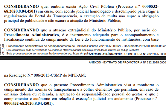 De acordo com o MP-AM, há indícios de que o Portal da Transparência municipal não está sendo alimentado de forma adequada, deixando de disponibilizar dados de forma clara, acessível e em tempo real, o que representa grave descumprimento da legislação federal.