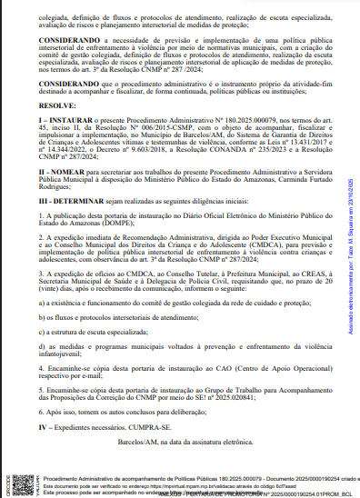O MP reforça que o acompanhamento é uma forma de garantir que o direito à educação, previsto como dever do poder público e da sociedade, seja cumprido de forma plena no município.