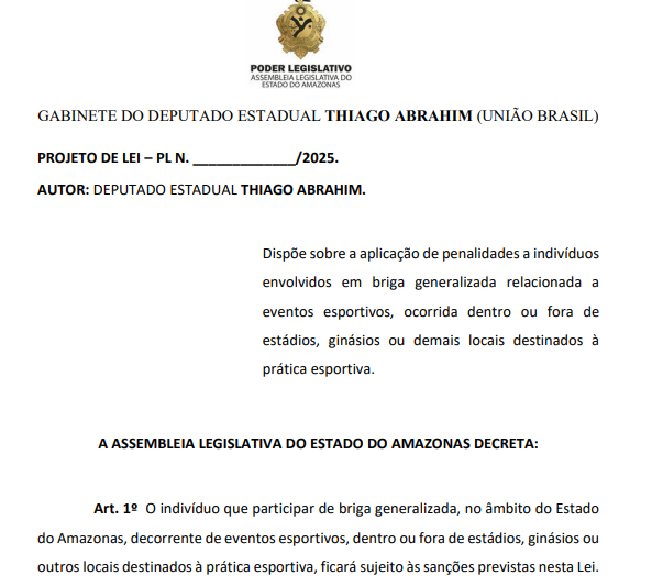 A Assembleia Legislativa do Amazonas (Aleam) recebeu um Projeto de Lei (PL) do deputado estadual Thiago Abrahim (União Brasil) que estabelece punições severas para pessoas envolvidas em brigas generalizadas relacionadas a eventos esportivos no estado. A proposta abrange confrontos dentro e fora de estádios, ginásios ou quaisquer locais destinados à prática esportiva.