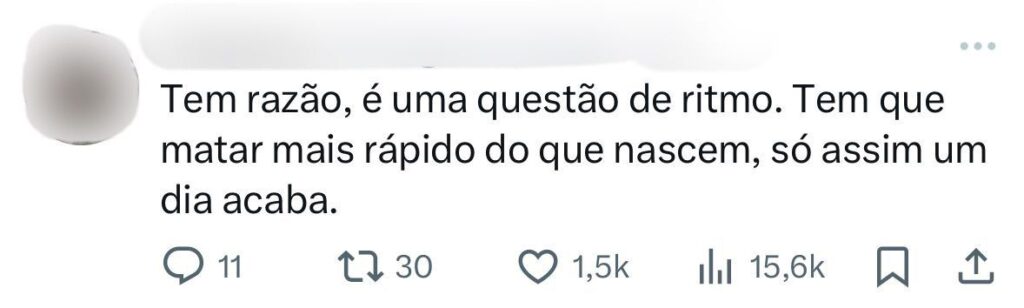 “Tem razão. É uma questão de ritmo. Tem que matar mais rápido do que nascem, só assim um dia acaba”, diz um dos comentários.