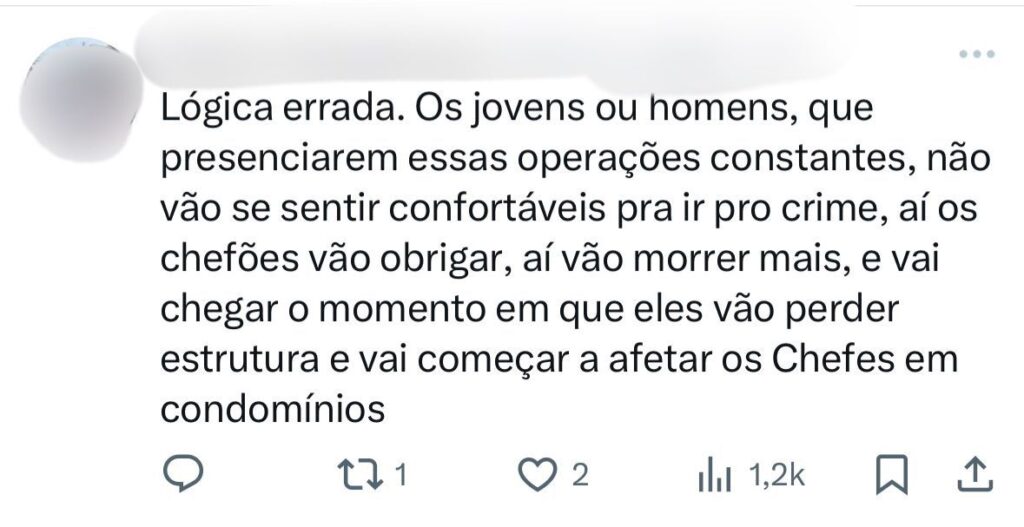 Há ainda quem critique a fala do parlamentar, afirmando que as ações causam medo na população. “Os jovens ou homens que presenciarem essas operações constantes, não vão se sentir confortáveis pra ir pro crime, aí os chefões vão obrigar”, diz um segundo internauta.