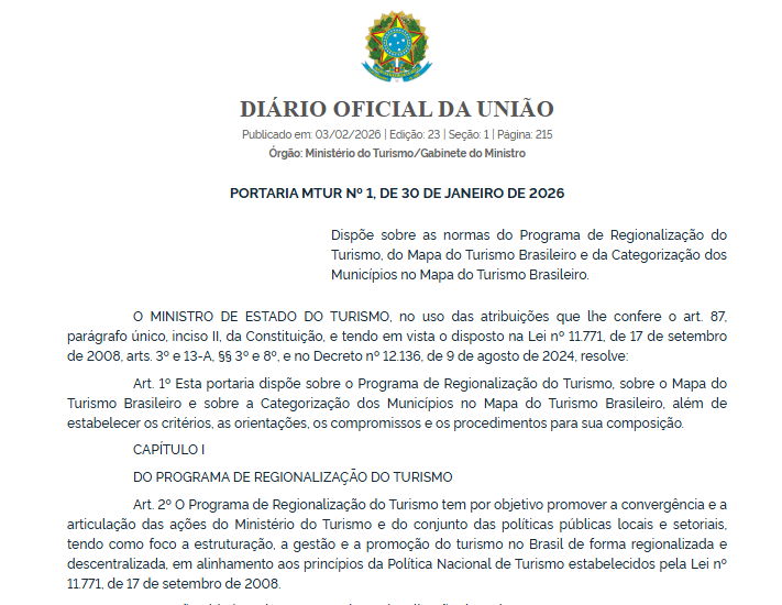 O Ministério do Turismo publicou nesta terça-feira (3/2) a Portaria nº 1 de 2026, que estabelece novas normas para o Programa de Regionalização do Turismo, o Mapa do Turismo Brasileiro e a categorização dos municípios que integram a política nacional do setor. A medida revoga a portaria anterior de 2025 e passa a valer a partir da data de publicação no Diário Oficial da União (DOU).