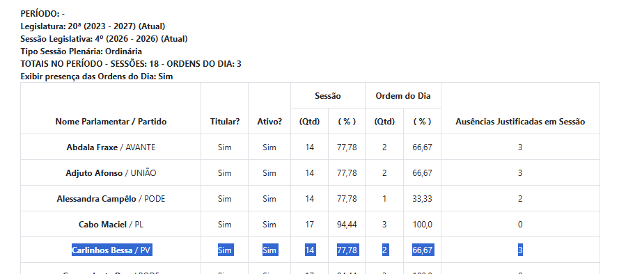 Se colocar em foco as presenças, na atual legislatura Bessa participou de 14 sessões plenárias, o equivalente a 77,78% de presença e esteve em apenas 2 ordens do dia, com 66,67%. Os dados indicam uma atuação que, embora não seja ausente, também está longe de protagonismo consistente no debate legislativo.