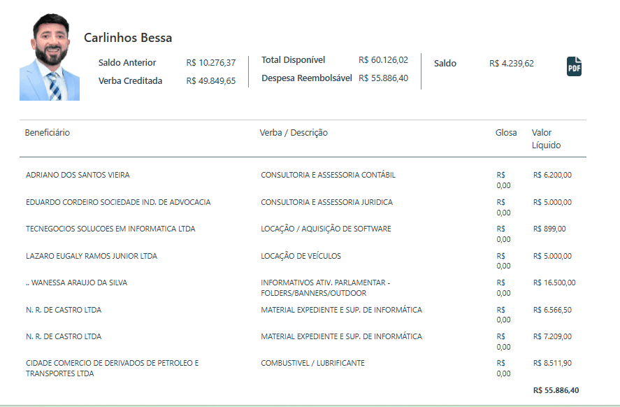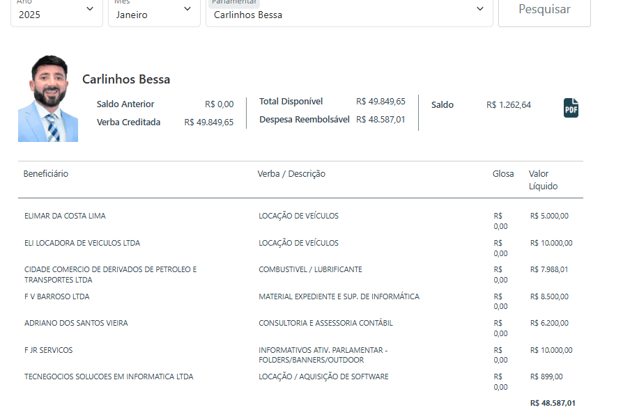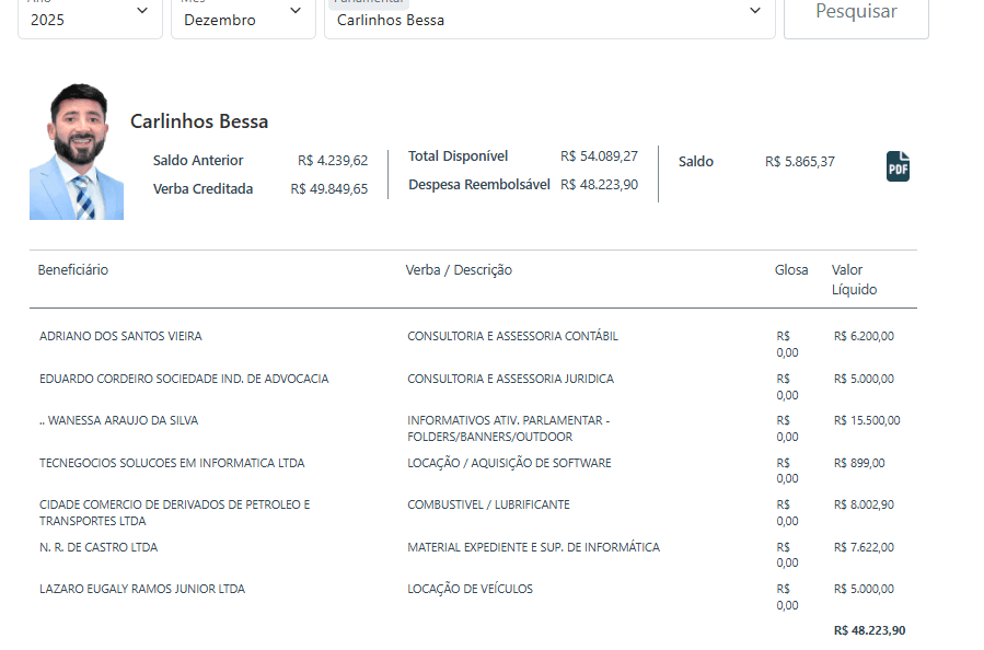 Outro ponto que chama atenção é o uso do chamado “cotão”. Ao longo de 2025, o parlamentar manteve um padrão elevado e contínuo de despesas, frequentemente consumindo grande parte da verba mensal de R$ 49,8 mil.