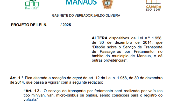 O vereador Jaildo Oliveira (PV) apresentou um Projeto de Lei (PL) na Câmara Municipal de Manaus (CMM) que altera a Lei Municipal nº 1.958, de 30 de dezembro de 2014, estabelecendo novas regras para os serviços de transporte por fretamento na capital amazonense.