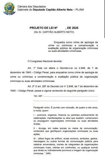 O Projeto de Lei 435/25 propõe enquadrar como apologia de crime ou de criminoso a comemoração e a exaltação pública de organizações criminosas ou de suas atividades. A proposta estabelece pena de quatro a oito anos de reclusão, além de multa. Autor da proposta, o deputado Capitão Alberto Neto (PL-AM) afirma que a glorificação do crime causa danos profundos à sociedade.