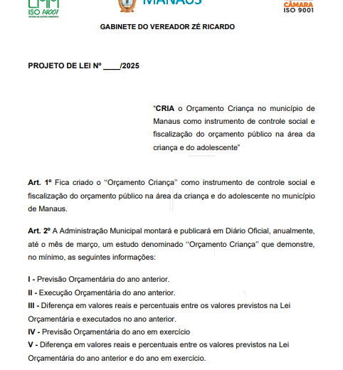 O vereador Zé Ricardo (PT) protocolou recentemente na Câmara Municipal de Manaus (CMM), um Projeto de Lei (PL) que pede a criação do “Orçamento Criança”, um instrumento de controle social e fiscalização dos gastos públicos voltados à infância e à adolescência na capital amazonense.