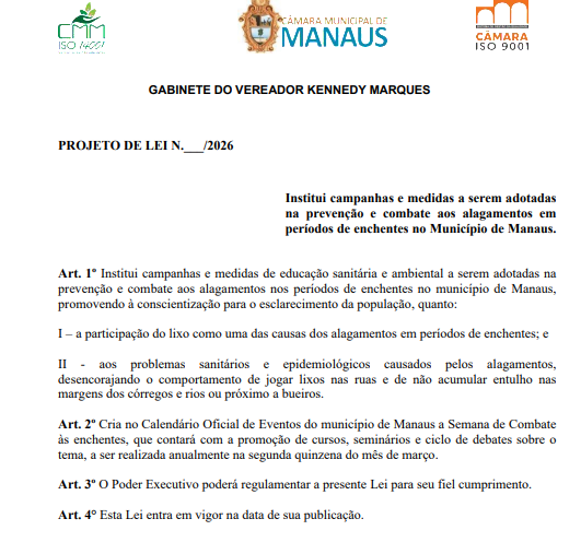 Está em tramitação na Câmara Municipal de Manaus (CMM) um projeto de lei de autoria do vereador Kennedy Marques (MDB), que institui campanhas e medidas de educação sanitária e ambiental para prevenir e combater alagamentos durante o período de enchentes na capital amazonense.