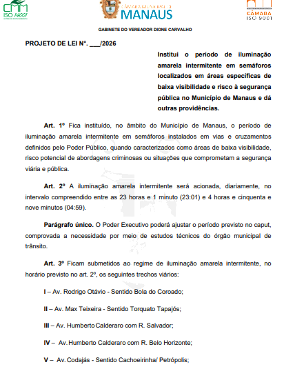 Uma proposta em tramitação na Câmara Municipal de Manaus (CMM) pretende mudar o funcionamento de alguns semáforos da capital durante a madrugada. O projeto de lei, de autoria do vereador Dione Carvalho (AGIR), institui o período de iluminação amarela intermitente em determinados cruzamentos da cidade para aumentar a segurança de motoristas.
