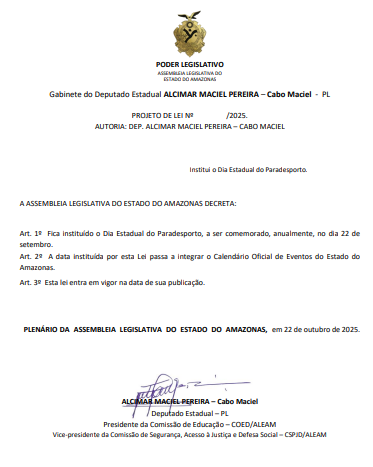 Foi protocolado na Assembleia Legislativa do Estado do Amazonas (Aleam), nesta a terça-feira (4), um Projeto de Lei (PL) do deputado estadual Cabo Maciel (PL), que institui o Dia Estadual do Paradesporto, a ser celebrado anualmente no dia 22 de setembro, e sugerindo também a data para o Calendário Oficial de Eventos do Estado do Amazonas.