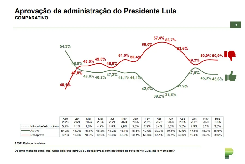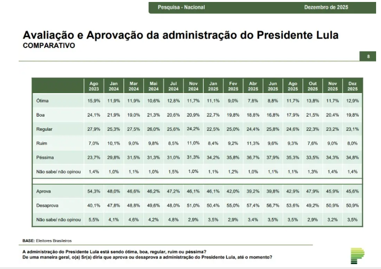 O governo do presidente Luiz Inácio Lula da Silva (PT) encerra o ano com índice de desaprovação maior que o de aprovação, segundo pesquisa do instituto Paraná Pesquisas divulgada nesta segunda-feira (29/12). De acordo com o levantamento, 50,9% dos entrevistados desaprovam a gestão do petista, enquanto 45,6% aprovam. Outros 3,5% não souberam ou não responderam.