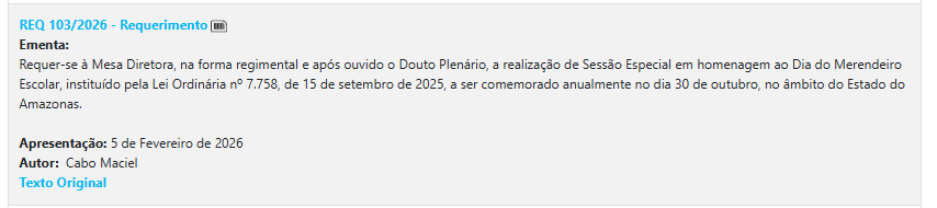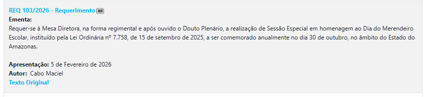 Nos primeiros dias de fevereiro de 2026, deputados estaduais do Amazonas movimentaram a Assembleia Legislativa do Estado do Amazonas (Aleam) com uma série de requerimentos que pleiteiam sessões especiais em reconhecimento a datas comemorativas, homenagens a categorias profissionais e campanhas de relevância social. A Rede Onda Digital realizou um levantamento com base no SAPL (Sistema de Apoio ao Processo Legislativo), para destacar quais são esses pedidos protocolados pelos parlamentares