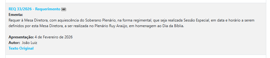 O deputado João Luiz (Republicanos) apresentou 23 requerimentos, que envolvem sessão especial alusiva ao Maio Laranja, homenagem à Indústria da Pesca e aos Trabalhadores do Setor, ao Dia do Capelão Evangélico e Militar, homenagem ao Dia Estadual do Gamer Consciente, Dia do Fisioterapeuta.