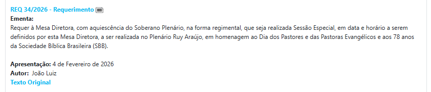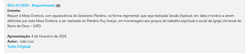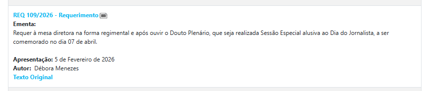 Jà a deputada Débora Menezes (PL), apresentou 19 requerimentos, onde possui uma série de pedidos de sessões especiais em 2026, propondo homenagens e celebrações ligadas a profissões e causas diversas. Entre elas, o Dia Internacional contra a Exploração Sexual e o Tráfico de Mulheres e Crianças, dia nacional de combate ao abuso e exploração sexual de crianças e adolescentes, Homenagem ao Dia Mundial de Combate ao Trabalho Infantil.