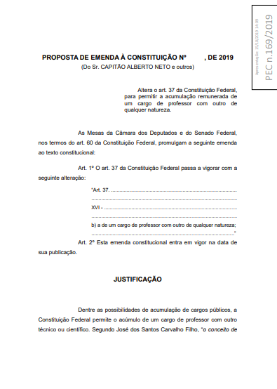 A proposta que autoriza professores do serviço público a exercerem outro cargo de qualquer natureza foi aprovada pela Câmara dos Deputados e agora segue para análise do Senado Federal. A medida altera as regras constitucionais sobre o acúmulo de funções no funcionalismo público. A PEC 169/2019, foi aprovada em dois turnos, é de autoria do deputado estadual do Amazonas, Capitão Alberto Neto (PL).