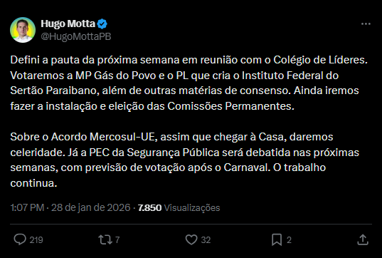 O presidente da Câmara dos Deputados, Hugo Motta (Republicanos-PB), afirmou em post nas redes sociais, nesta quarta-feira (28/1) que a Proposta de Emenda à Constituição da Segurança Pública poderá ser votada após o carnaval. Antes disso, o texto ainda precisa passar pela comissão especial responsável por analisar a matéria.