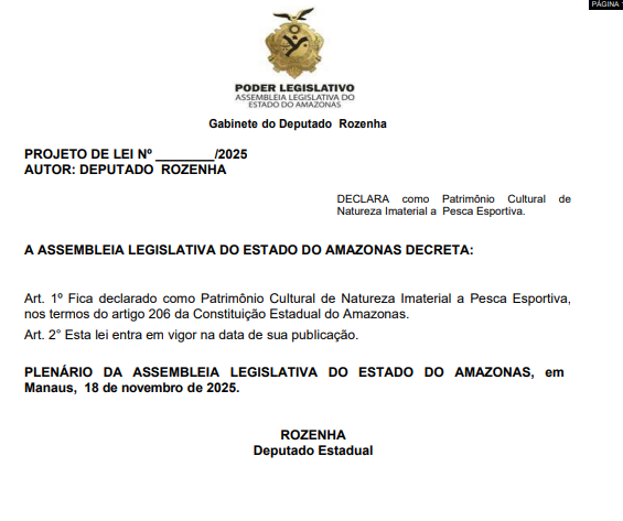 O deputado estadual Rozenha (PMB) protocolou na Assembleia Legislativa do Estado do Amazonas (Aleam) um projeto de lei que declara a Pesca Esportiva como Patrimônio Cultural de Natureza Imaterial do Estado. A proposta se baseia no artigo 206 da Constituição Estadual e busca reconhecer oficialmente a relevância histórica, social, econômica, ambiental e cultural da atividade para a identidade amazônida.