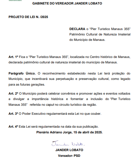 Na justificativa, o parlamentar destaca que o Pier Turístico Manaus 355 está localizado em uma área estratégica da orla fluvial de Manaus e se consolidou como um espaço de vivência coletiva e valorização da cultura e da identidade ribeirinha.