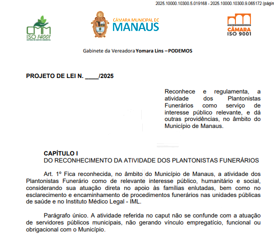 Está em tramitação na Câmara Municipal de Manaus (CMM), um projeto de lei de autoria da vereadora Yomara Lins (Podemos) que reconhece oficialmente a atividade dos plantonistas funerários como de relevante interesse público, humanitário e social na capital amazonense. A proposta regulamenta a atuação desses profissionais que auxiliam famílias enlutadas nos hospitais públicos e no Instituto Médico Legal (IML), orientando sobre trâmites e documentação necessários para liberação de corpos e acesso a serviços funerários, incluindo o SOS Funeral.