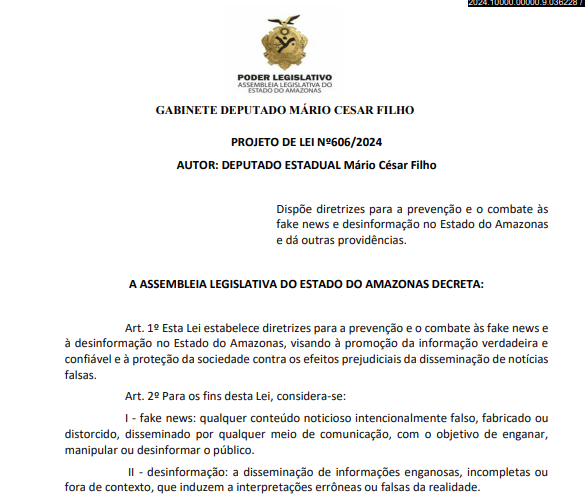 Está em tramitação na Assembleia Legislativa do Amazonas (Aleam) um projeto de lei apresentado pelo deputado estadual Mário César Filho (União Brasil), que estabelece diretrizes para enfrentar a disseminação de fake news e conteúdo de desinformação em todo o Estado. A proposta busca promover informação confiável, fortalecer a formação crítica da população e proteger a sociedade dos impactos negativos causados pela circulação de notícias falsas.