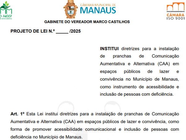 O vereador Marco Castilhos (União Brasil) apresentou um Projeto de Lei (PL) na Câmara Municipal de Manaus (CMM) que institui diretrizes para a instalação de pranchas de Comunicação Aumentativa e Alternativa (CAA) em espaços públicos de lazer e convivência na cidade de Manaus.