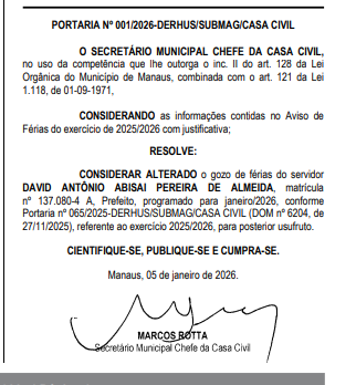 O prefeito de Manaus David Almeida (Avante), teve o período de férias previsto para janeiro de 2026 adiado. A decisão consta na Portaria nº 001/2026, publicada no Diário Oficial do Município (DOM).