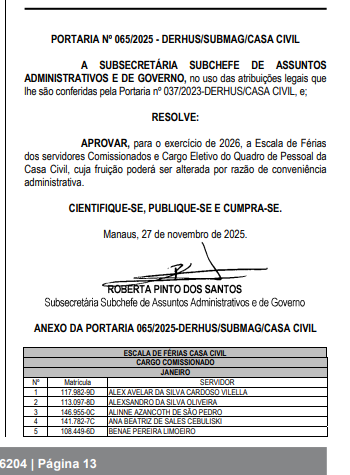 A portaria nº 065/2025 foi assinada pela Subsecretária subchefe de assuntos administrativos e de governo.