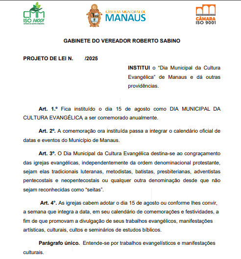 Análise de mandato: Principais projetos de Roberto Sabino na Câmara de Manaus focam entre fé e segurança