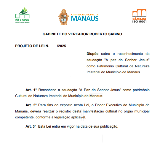 PL que reconhece a saudação “A Paz do Senhor Jesus” como patrimônio cultural imaterial;