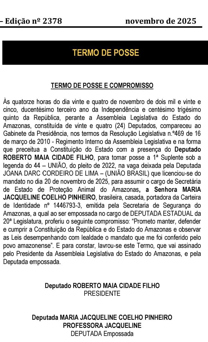 A Assembleia Legislativa do Estado do Amazonas (Aleam) oficializou, em publicação no Diário Oficial do Legislativo, em edição publicada no dia 24 de novembro deste ano, a posse da professora Maria Jacqueline Coelho Pinheiro, conhecida como Professora Jacqueline, que assumiu o mandato de deputada estadual da 20ª Legislatura. A cerimônia ocorreu às 14h, conforme Termo de Posse publicado no Diário Oficial, com assinatura do presidente da Casa, deputado Roberto Maia Cidade Filho, ambos do União Brasil.