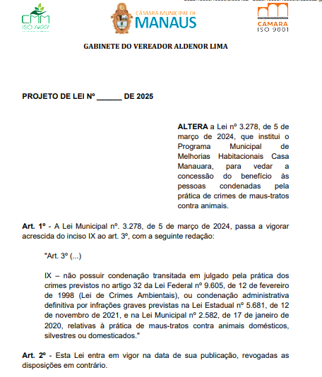 O vereador Aldenor Lima (União Brasil) protocolou um Projeto de Lei (PL) na Câmara Municipal de Manaus (CCM) que busca fortalecer as políticas de proteção animal na capital amazonense. A proposta acrescenta a Lei Municipal n.º 3.278/2024, que instituiu o Programa Casa Manauara, para impedir que pessoas condenadas por maus-tratos a animais recebam o benefício habitacional.