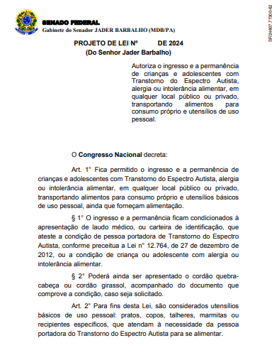 O texto garante ainda que os beneficiários possam levar utensílios necessários para suas refeições e autoriza os estabelecimentos a solicitar laudo médico ou documento de identificação que comprove a condição. Cordões de identificação, como o de quebra-cabeça ou de girassol, poderão ser usados como comprovantes complementares.