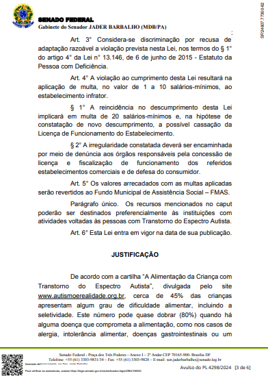 O projeto altera o Código de Defesa do Consumidor e a Política Nacional de Proteção dos Direitos da Pessoa com Transtorno do Espectro Autista. A versão original previa punições, como multas de até 20 salários mínimos e até a cassação da licença de funcionamento para estabelecimentos que descumprissem a norma. No entanto, o novo texto restringe a aplicação da regra apenas a locais onde o consumo de alimentos é permitido, como praças de alimentação e restaurantes.