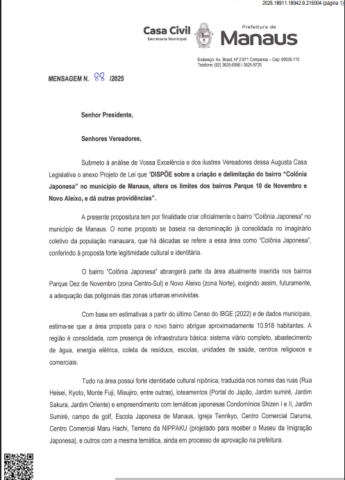 A Prefeitura de Manaus encaminhou à Câmara Municipal de Manaus (CMM), o Projeto de Lei nº 692/2025, que propõe a criação e delimitação do bairro “Colônia Japonesa” na zona urbana da capital. A proposta redefine os limites dos bairros Parque 10 de Novembro e Novo Aleixo, e prevê uma área de 408 hectares para abrigar o novo território, que terá identidade inspirada na cultura japonesa.