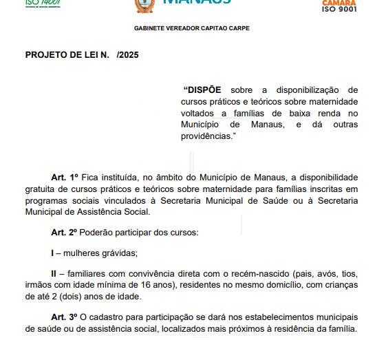 A Câmara Municipal de Manaus (CMM) recebeu um Projeto de Lei (PL) do vereador Capitão Carpê (PL), que prevê a criação de cursos gratuitos, práticos e teóricos, sobre maternidade voltados para famílias inscritas em programas sociais da capital amazonense. A proposta tem como objetivo oferecer apoio, conhecimento e preparação às gestantes e familiares que convivem diretamente com recém-nascidos.