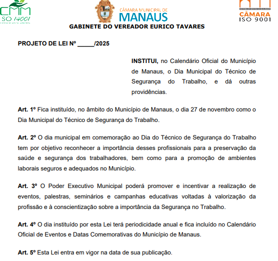 A Câmara Municipal de Manaus (CMM) analisa um projeto de lei de autoria do vereador Eurico Tavares (PSD) que propõe a criação do Dia Municipal do Técnico de Segurança do Trabalho. A data sugerida é 27 de novembro e passará a integrar o Calendário Oficial de Eventos e Datas Comemorativas do município, caso a proposta seja aprovada.