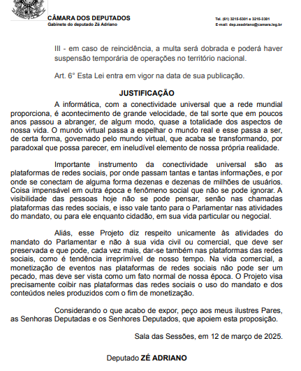Pelo texto, as plataformas digitais ficariam impedidas de oferecer, habilitar ou permitir qualquer forma de monetização direta ou indireta para esses perfis, o que inclui o recebimento de valores por visualizações, engajamento ou impulsionamento de publicações vinculadas à atividade parlamentar.