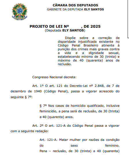 O Projeto de Lei 4916/25 propõe endurecer as penas para crimes contra a vida e a dignidade sexual, fixando reclusão de 30 a 40 anos para homicídio qualificado, feminicídio e estupro com resultado de lesão corporal grave ou morte. A iniciativa é da deputada Ely Santos (Republicanos-SP), e está em tramitação na Câmara dos Deputados.