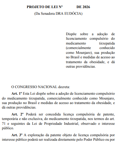 O Senado Federal vai analisar o Projeto de Lei 160/2026, que autoriza o governo a conceder licenciamento compulsório da tirzepatida, medicamento comercializado como Mounjaro, mesmo que o produto ainda esteja protegido por patente. A proposta foi apresentada pela senadora Dra. Eudócia (PL-AL) e ainda aguarda despacho para as comissões temáticas.