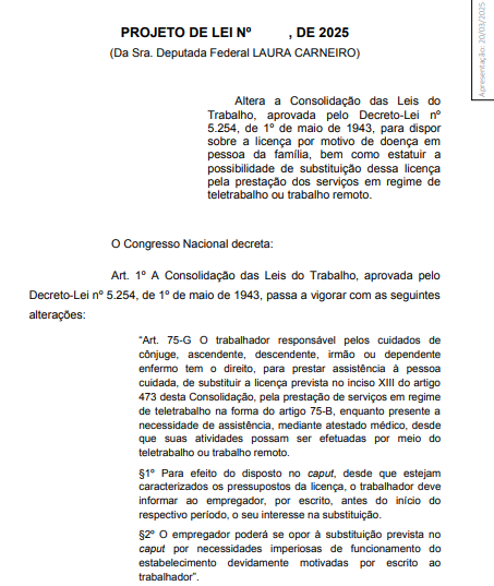 A proposta também prevê a possibilidade de substituição da licença pelo teletrabalho durante o período necessário ao cuidado do familiar, desde que as atividades exercidas sejam compatíveis. Para isso, o trabalhador deverá manifestar o interesse ao empregador por escrito antes do início do afastamento. O empregador, por sua vez, poderá negar a substituição em razão de necessidades específicas do estabelecimento, devendo justificar a decisão formalmente.